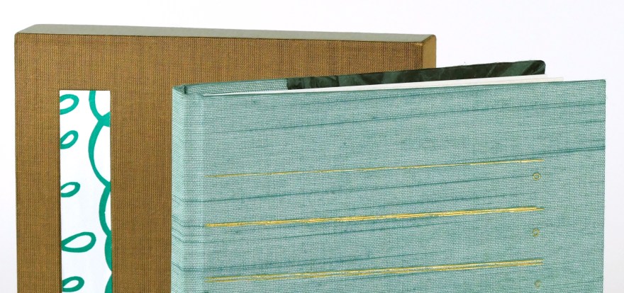 The book is bound as a drum-leaf with silk & paper hard-cover (hotstamped), approximately 6×6″. Produced in an edition of 10, a couple of which are for sale. The price is $350.